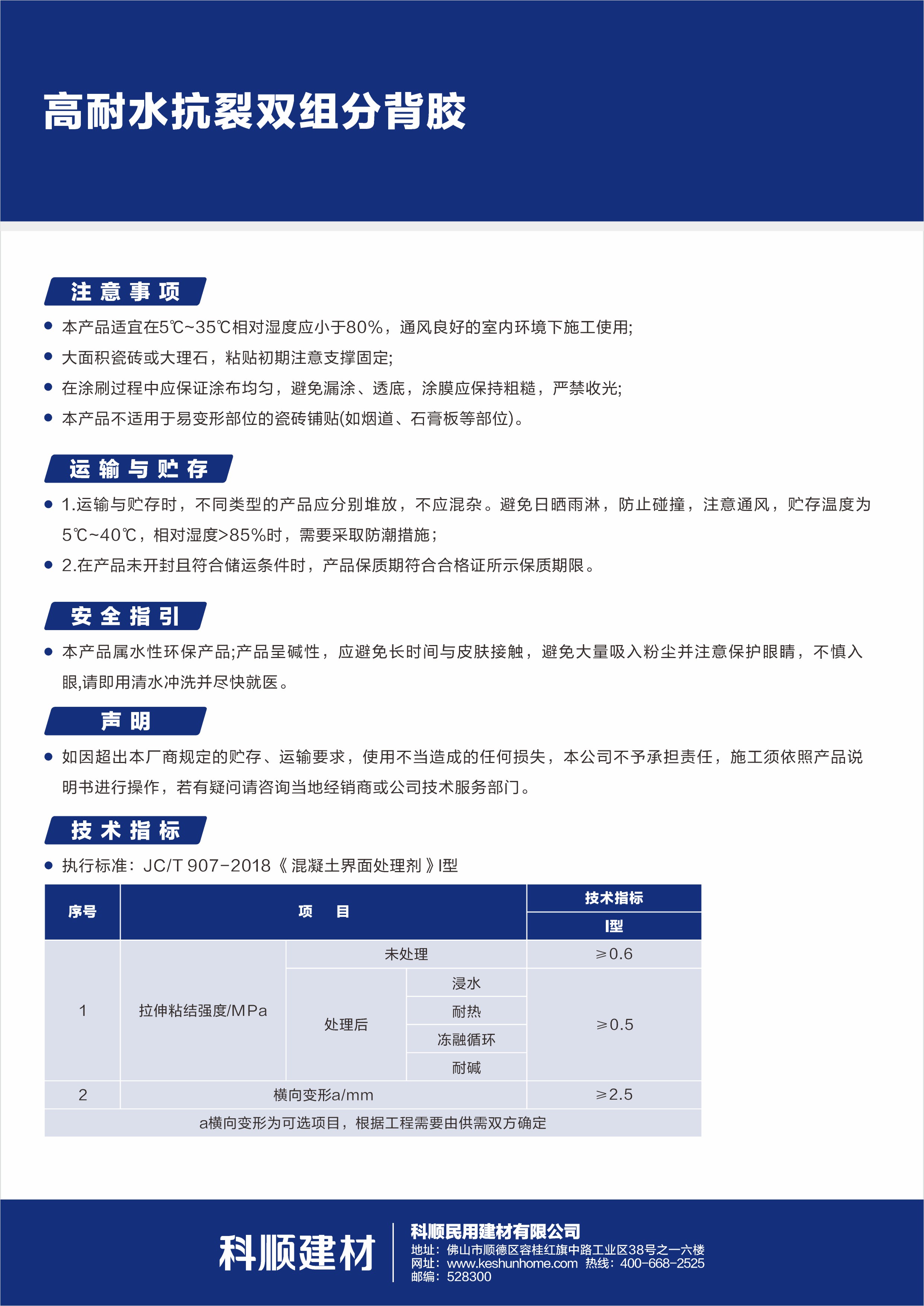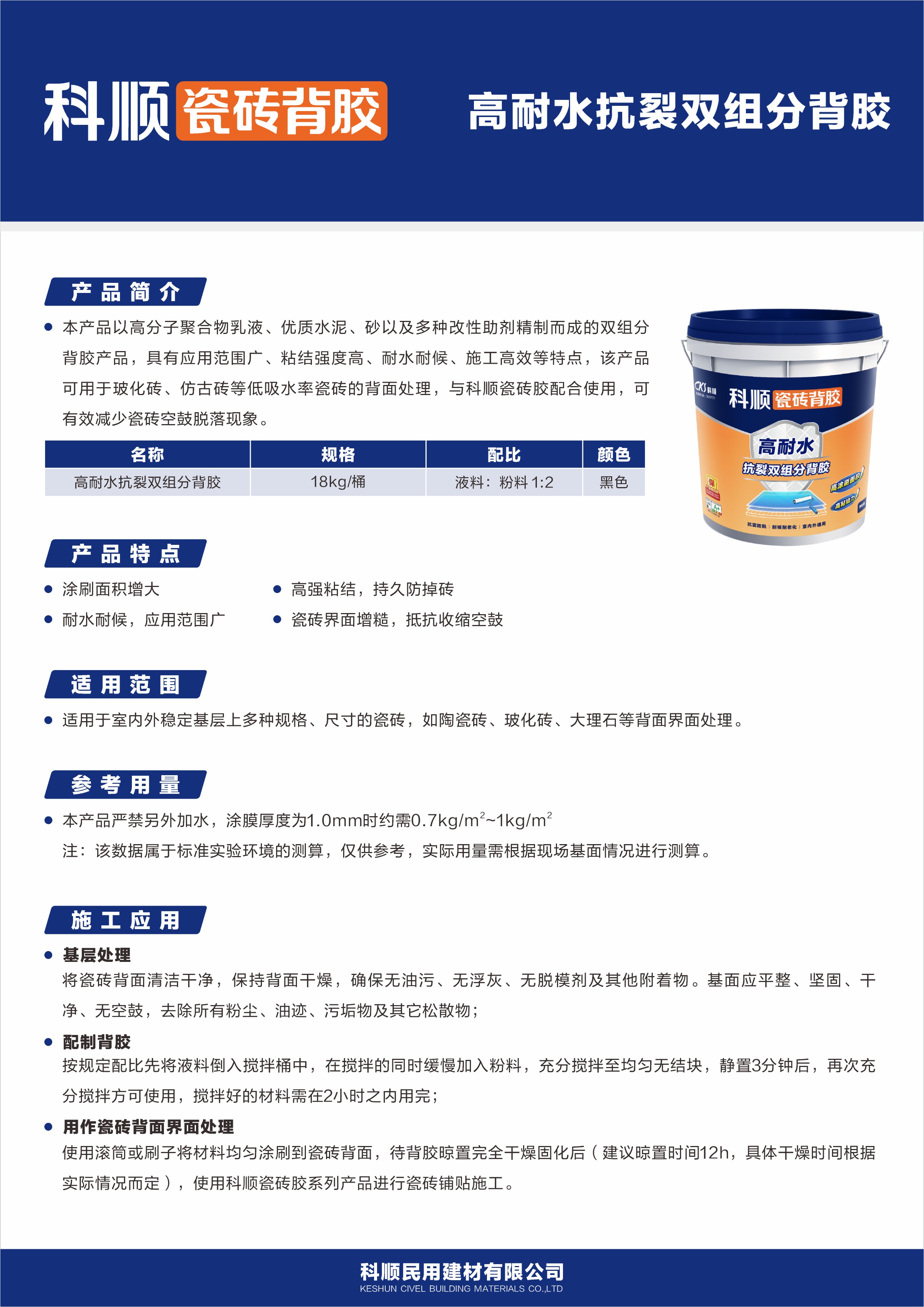 本產品以高分子聚合物乳液、優質水泥、砂以及多種改性助劑精制而成的雙組分背膠產品,具有應用范圍廣、粘結強度高、耐水耐候、施工高效等特點,該產品可用于玻化磚、仿古磚等低吸水率瓷磚的背面處理,與科順瓷磚膠配合使用,可有效減少瓷磚空鼓脫落現象。